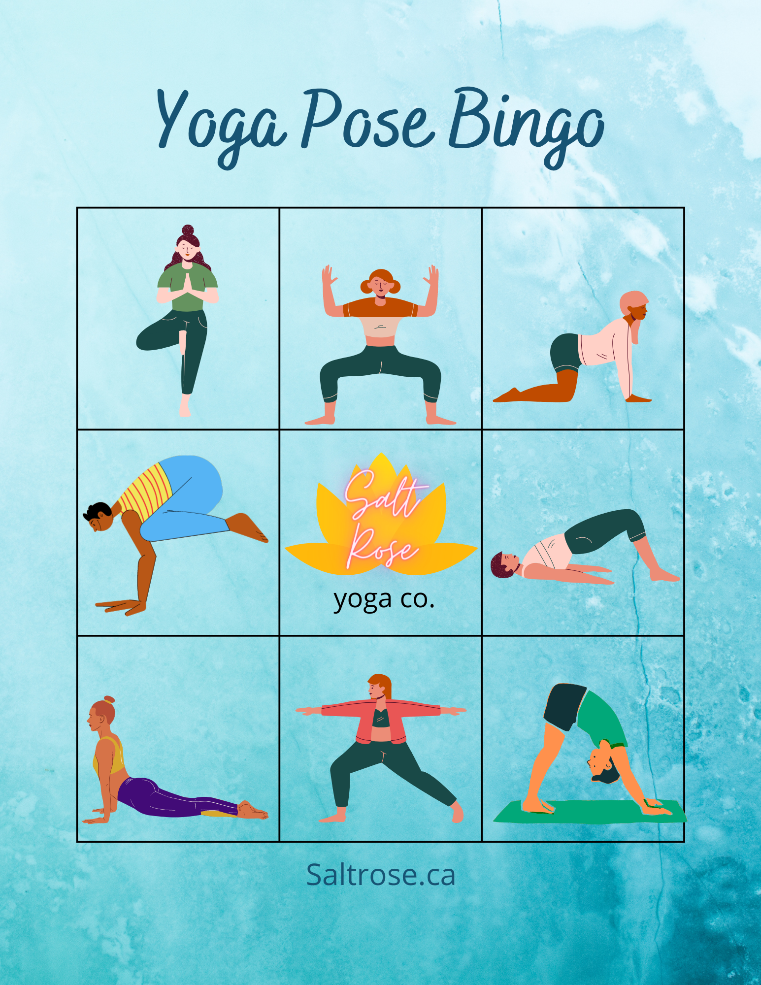 Cut out all the poses from the calling card and place them in a container. draw them at random and everyone who has that pose does the pose and puts a marker on their Bingo card. First person to get a line gets BINGO!